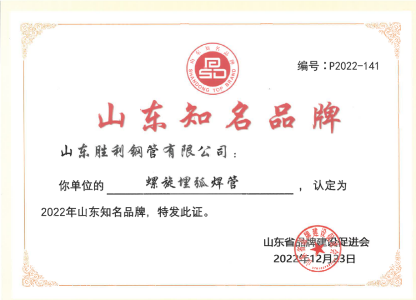 山東勝利螺旋埋弧焊管產(chǎn)品順利通過(guò)2022年度“山東知名品牌”榮譽(yù)認(rèn)證。2022年7月26日認(rèn)證工作啟動(dòng)后,公司積極參加認(rèn)證工作,認(rèn)真組織各項(xiàng)申報(bào)材料,登錄認(rèn)證平臺(tái)提交申報(bào)材料,并承諾確保申報(bào)材料的真實(shí)性、準(zhǔn)確性和有效性?!吧綎|知名品牌”榮譽(yù)的獲得,將大大有助于公司螺旋埋弧焊管進(jìn)一步拓寬省內(nèi)外銷售市場(chǎng),有助于爭(zhēng)取更多的社會(huì)市場(chǎng)訂單。